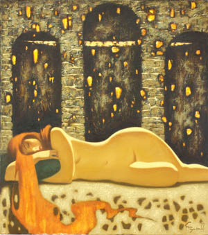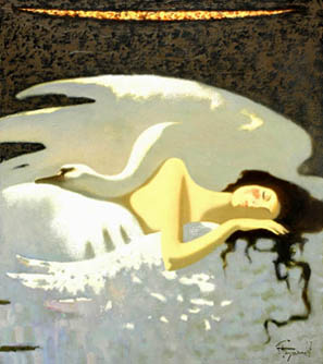 《列达》画一裸女横卧在白色卧榻上,体态优雅,笼罩着耀眼的光。在粗糙坚硬的石墙对比下,裸女显得格外晶莹灵透。背景上,光斑如雪片般靜靜降落,造成神秘气氛;红发飘逸,于静中见动,激活了画面,与闭目静睡的裸女形成对比。可惜我们无法查询画家所表达的故事内容,只能就画面进行读解。