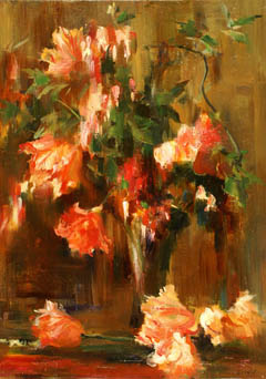 叶西科夫·巴雅尔·弗拉基米尔罗维奇的《荷兰郁金香》作品热情,奔放。这幅静物画很好地体现了画家的艺术追求,一幅静物花卉,并不拘泥描绘花朵和枝叶,而是注重画面的整体气氛,笔法灵动,概括,充满表现主义的张力,色彩浓艳而沉稳,构图饱满丰富,是一幅既大气又轻松的静物佳作。