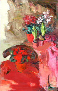 这幅题名为《花》的静物画,前景是红色的花、花盆、桌布和深色的椅背;中景是粉红色的桌布、粉绿的叶子和几朵白花,并有红花红盆和前景呼应;背景是山体似的涌动的暖灰色块。焦点定在中景,只有中景精雕细刻,只有中景清楚、丰富和响亮,其它,该放松的地方放松,该放弃的地方停笔不画,只留画布。画家具有很强的组织和控制画面的能力。