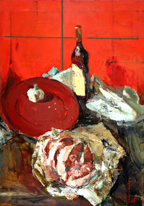 这副名为《红色情调》的作品中所描绘的静物,并不是俄餐中讲究的“三道菜(汤,沙拉和热菜)”,因为那些传统的食材是不适合达利娅的口味的!当然,这不是在说达利娅的饮食习惯,而是指她的绘画风格。