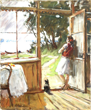 《雨中》的少女无所事事地望着门外,斜依着敞开的门,赤脚踩在门槛上,尽情享受着凉爽湿润的空气。女孩仅仅是背影,我们却能感受到的寂寞和惆怅,旁边有小猫陪伴,为画面增加了几许生活的情趣。