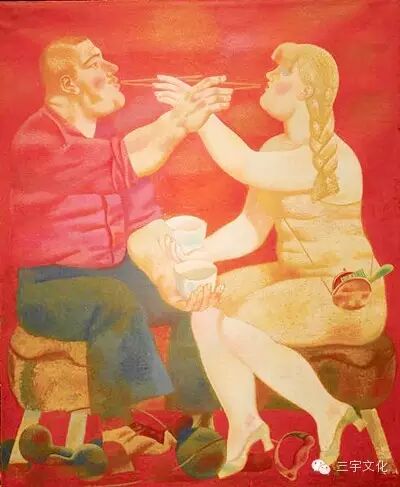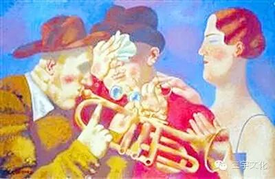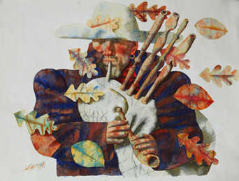 《风笛》这幅画追求的是一种表现主义和浪漫主义效果;画面中布满了飘浮状态的落叶和丰收的果实,装点着整个画面,营造了厚重的美感与人文情趣……当然那些不是一般具象意义上的叶子或其他什么……那是具有生命体象征意义的某种生灵的符号,这种叠加的效果使画面积聚了深深的思想性,充满了浓浓的诗意。形式美是一种手段而并非目的,任何形式美都是为表达其内容而服务的,当然两者要达成高度的统一。